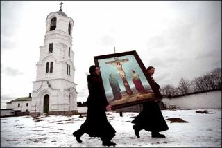 — Deux Moines portant une icône, Monastère Alexandro-Svirsky, Russie, 2001. Tirage Lambda. 1/10. 80 x 120 cm.