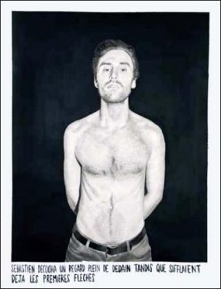 Rock n’ roll et arrogante est l’attitude qui suinte des photographies de Léo Dorfner qui capte des individus sûrement tout droit sortis de la nuit parisienne. Leur posture est brute, comme en attente. Ainsi de l’aquarelle sur papier intitulée Sébastien décocha un regard plein de dédain tandis que sifflaient déjà les premières flèches, où l’expression d’un homme au torse glabre mélange renoncement et désir, envie et dégoût d’être vu.