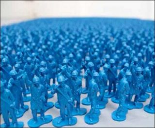 Plus étanche à l’interprétation est l’expression de la jeune femme grimée comme un clown triste sur l’autoportrait en peinture de Florence Obrecht. L’indifférence, la lassitude extrême de son regard nous saisit, lassitude peut-être d’être vue sous ce maquillage de spectacle et ces atours fleuris, couronne et robe, qui invitaient pourtant à la fête. L’autoportrait pourrait condenser à lui seul «La figure de l’artiste dans notre société contemporaine» que l’exposition «Seuls / ensemble» a souhaité observer de près. Avec l’œuvre Le sens de la vie, qui aligne une infinité de petits ouvriers bleus alignés, Florent Lamouroux regarde, lui, le pouvoir ou non de se vivre artiste au sein de la société au prisme de la multitude dont l’injonction peut tétaniser l’autonomie de création. Florent Lamouroux met ici cette multitude autoritaire à petite échelle, lui donnant ainsi un pouvoir dérisoire.