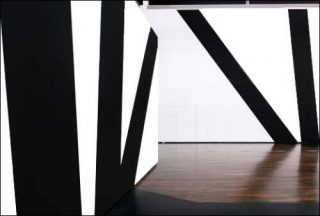 Seven Corridors se définit ainsi comme «un tableau mis en 3D» dans lequel nous sommes invités à déambuler. L’œuvre apparaît surtout comme un «white cube» traversé de bandeaux noirs incrustés sur le sol, dessinant des couloirs (sept au total, d’où le nom du projet de François Morellet). Ces bandes noires se projettent également sur les murs de la salle d’exposition, esquissant des X, des Y, et nous drainent vers l’intérieur du cube. Elles nous invitent donc à suivre leurs traces et à nous engouffrer dans l’installation, qui a la prétention de fonctionner comme un «labyrinthe».