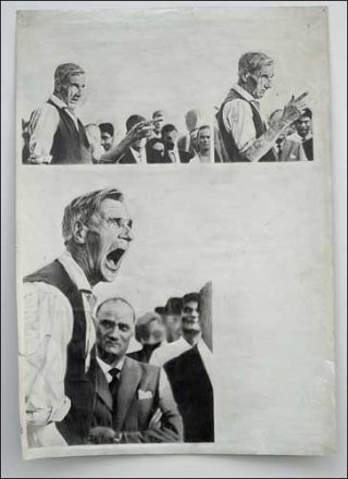 Au contraire, Ian Tweedy fait dans le dessin figuratif pur et dur, noir et blanc, à partir de clichés photographiques — dans le cas présent, d’images trouvées, prises par des auteurs anonymes. Un orateur populiste haranguant une foule acquise à sa cause, au bras gauche orné de nombreux tatouages, est représenté sous trois angles différents. L’artiste joue avec le premier plan net et avec le flou de l’assistance venue écouter le démagogue.