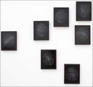 Lisa Oppenheim a conçu et mis au point, si l’on peut dire, une installation asymétrique juxtaposant sept tableautins aux motifs circulaires parsemés de taches de son sur fond noir, n’ayant qu’un rapport lointain avec les thèmes qui les ont motivés — le Traité de paix égypto-israëlien de 1979, l’arrivée des Beatles à New York en 1964, Ralph Ditter, le barbier de Zanesville dans l’Ohio, en 1967, la Maison Galloway, les descendants de cette noble lignée écossaise, en 1978, le débat présidentiel de 1960 entre Kennedy et Nixon, retransmis par les chaînes ABC-CBS-NBC, les élégants truands Bonnie et Clyde en 1933, le Che en 1960, sans doute vu par le photographe Alberto Korda.