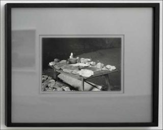 Lorna Macintyre travaille sur les légendes — celles que nous transmettent les conteurs traditionnels comme celles des récits littéraires. Certaines d’entre elles sont susceptibles d’être illustrées par des photographies. Dans un cas, on obtient une table recouverte de pierres, en plein air, dans la nature, une composition en plongée, aussi «classique» ou évidente que la première photo de l’histoire — Point de vue pris d’une fenêtre du Gras à Saint-Loup-de-Varennes de Niépce (1827). Dans l’autre, un jeu de miroir ou d’inversions en tous sens (haut-bas-gauche-droite) à partir du cliché d’un randonneur tiré à quatre épingles et en autant d’exemplaires, sur fond argenté.