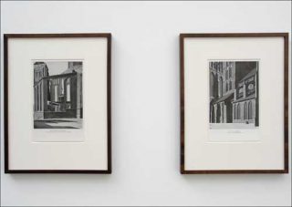 Haris Epaminonda fait dans l’intervention minimale, discrète, imperceptible — du moins au premier coup d’œil. Elle a accroché sagement deux petits formats présentant l’un une vue d’église et l’autre la place d’une petite ville. Les deux illustrations ont été soigneusement retouchées au cutter, bistouri ou scalpel — des plans ont été rapportés, rajoutés, d’autres enlevés, à tout jamais effacés du paysage.