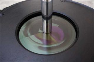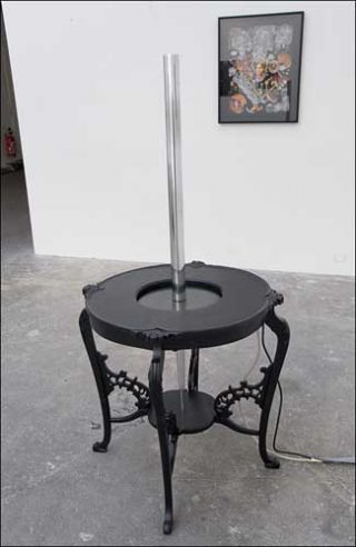 Mat Collishaw propose une «installation» astucieuse, fonctionnant parfaitement, se déclenchant à l’approche du spectateur, intitulée Skin Flick, une étrange anamorphose en mouvement montrant un torero au travail, en train de faire une passe de matador à un animal cornu. Le plan assez bref du film en couleur indéfiniment projeté en boucle se reflète sur un tube métallique posé à la verticale, sur un guéridon en bois d’autrefois, circulaire comme une arène. Le cylindre est l’écran ou l’écrin argenté sur lequel on peut lire à la juste proportion l’image décryptée — désanamorphosée.