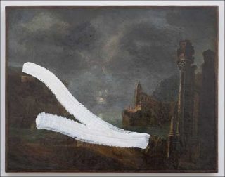 Un tableau académique relativement ancien est gâché par une grossière traînée de poudre ou plutôt de peinture blanche exécutée sans effet de style par un vandale et fier de l’être, Cyprien Gaillard, dans un ou une geste se voulant rebelle, mais tombant, selon nous, à plat, en 2009, soit un siècle après la publication du manifeste futuriste aux accents anti-culturels.