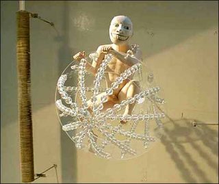 Suzanne Starke a suspendu un immense lustre, dans lequel est niché un personnage mi-ange, mi-démon. Un masque diabolique vient recouvrir le visage d’un corps enfantin, plongeant son regard fixe dans les yeux de qui vient se placer sous ce lustre menaçant.