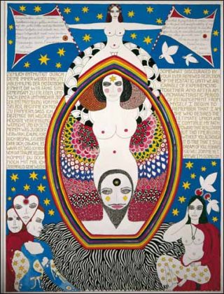 Arrachées au temps destructeur et aux anecdotes réductrices, ces peintures croisent les références bouddhistes et le combat des Amazones. Loin d’un féminisme sectaire et réactif, Dorothy Iannone lève un bras pour la liberté de l’homme, l’autre pour celle de la femme. Les deux sexes sont sans cesse accouplés, s’emboîtent et se répondent, se caressent l’un l’autre tour à tour.