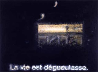 Certaines peintures comportent un sous-titre qui infiltre le tableau, comme le fait de façon plus abstraite le titre lui-même. Image de film ou plutôt de vidéo, l’écriture y est peinte tremblotante et labile comme l’est la texture d’une mauvaise image télévisuelle, image à partir de laquelle travaille le peintre, comme à d’autres occasions, il se sert de la photographie. Ainsi, peut-on lire issues de sources diverses, en décalage avec la représentation qui se donne à voir : « La vie est dégueulasse » ou « Car en réalité, il titre les ficelles », dans l’œuvre intitulée Voix # 37 (st Paul) ou encore, le mot « Sun » apparaissant en filigrane dans l’espace représenté de Sun # 4, — éclat d’un hypothétique soleil ou slogan publicitaire qui traverserait l’intime image du couple ?