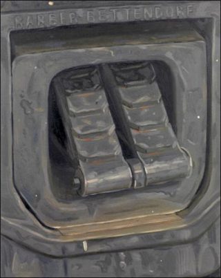 En fait Josephine Halvorson ne choisit pas ces objets au hasard. Ils sont toujours liés à sa propre histoire. Par exemple l’ensemble de cinq panneaux reproduisant en trompe-l’oeil un tableau noir d’école est la réplique de celui de sa classe de peinture à l’Université de Princeton où elle enseigne. Elle s’inspire aussi de la culture industrielle du Massachusetts, sa région natale, quand elle prend pour sujet des pièces mécaniques ferroviaires comme ici des amortisseurs.