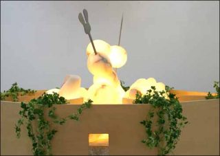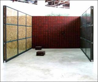 — Zen Garden, 2000. Installation : albâtre, fer, poutres en plastique, ampoules électriques, sable, bois, cailloux. Dimensions variables.