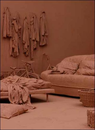 — Chambre de purification, 2003. Installation : objets trouvés, argile, murs, sol. Dimensions variables.