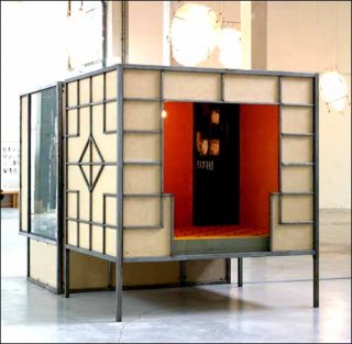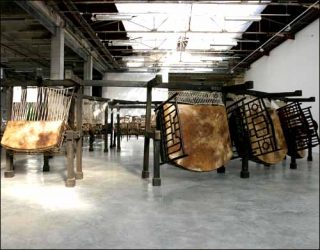 — Jue Chang (The Last Song) — Dancing Body/Drumming Mind, 2000. Installation : bois, métal, chaises, lits, peau de vache, ficelle, cordes. Dimensions variables.