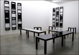 — Liam Gillick, Rest area racks 1-3, 2011. Tables et tabourets, poudre aluminium et plexiglas. 3 x (200 x 30 x 8 cm), 100 x 100 x 30 cm, 3 x (45 x 45 x 45 cm)