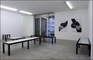 — Liam Gillick, Sit in the machine, 2011. Affiches et bancs, poudre aluminum, impression sur papier, aimant. 200 x 50 x 45 cm, 2 x (119 x 84 cm)