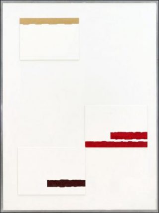 La formule du titre «Six fois Shem en deux» peut s’énoncer comme la répartition en deux espaces de six manifestations d’un shem unique — format présent dans le travail de l’artiste depuis quelques années et qu’il décrit en termes simples: des «plaques de plexiglas peintes de couleur parchemin, qui laissent apparaître des bandes horizontales colorées, or, rouge et brun» (Jean-Pierre Bertrand, entretien avec Didier Morin, dans Mettray, septembre 2010); trinité chromatique qu’il définit parfois comme les trois états d’un sang «oréfié», vif et coagulé. Les formats du grand fond et des plaques qui y affleurent sont invariants, leurs coordonnées sont fixes et leurs rapports, déterminés; seules leurs occurrences varient. Une fois leur partition générale mémorisée, on ressent que d’un shem à l’autre les variations internes s’annulent en se «dénonçant»: présences et absences se désignent mutuellement. Voilà pourquoi il n’y aurait en fait qu’un seul shem, dont les occurrences se coexisteraient dans leur totalité. En linguistique, ce type d’instance ordonnatrice s’appelle un schème: une structure organisatrice, elle-même organisée par les règles de combinaisons de ses constituants. Il y a donc entre shem et schème une correspondance qui dépasse la simple homophonie, puisque «shem», signifiant «nommer» en hébreu, dérive probablement de la racine primaire «suwm», «placer, ordonner, établir». L’étymologie (sacrée) révèle ainsi la puissance édifiante du shem/schème qui fonde et désigne.