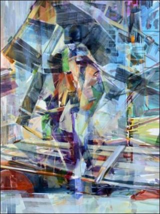 L’artiste révoque par là toute lecture unilatérale ou unidimensionnelle de la vie humaine. Ainsi, plus qu’un monde ou une société chaotique, plus que des personnages aux contours flous, il s’agit de considérer l’existence comme un mouvement continu, un flux en perpétuelle évolution. Là se trouve la clé des œuvres de Duncan Wylie: comment occuper l’espace de la toile et rendre compte du mouvement incessant du monde, de son entropie?