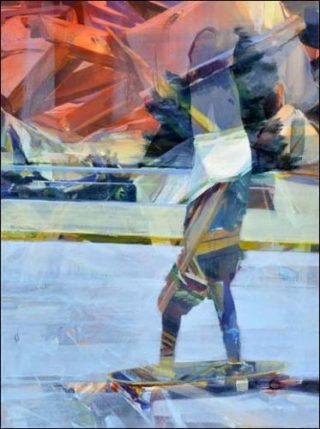 Nous découvrons une autre figure archétypale des toiles de Duncan Wylie, le skateur, qui lui aussi, à sa manière, évolue comme un équilibriste dans les structures urbaines contemporaines… surtout lorsque l’artiste le représente en train d’exécuter un poirier sur sa planche à roulettes! Là encore, Duncan Wylie s’inspire d’une de ses peintures datant de 2012, The Wave, pour donner forme à son personnage. Car quel type de personnage pourrait bien intégrer cette immense vague de matériaux urbains, se demande l’artiste? Un surfeur? Non, plutôt un skateur qui s’inscrit à la fois dans le registre de la glisse, du mouvement, et de la ville.