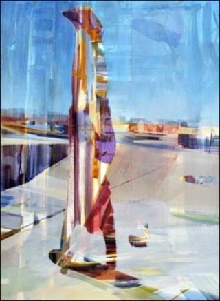 Autre figure déclinée par Duncan Wylie sur plusieurs toiles: le funambule. Si les traits de ce personnage sont parfois extrêmement précis, néanmoins, sa silhouette se dédouble systématiquement, comme s’il penchait un coup à droite, un coup à gauche, à la recherche d’un équilibre précaire dans le tumulte persistant du monde contemporain.