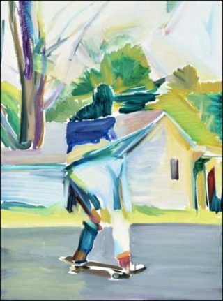 L’un des skateurs de Duncan Wylie retient particulièrement notre attention. Dans un format moyen, une silhouette de skateur se laisse deviner. Elle apparaît comme une forme spectrale, un «homme invisible», un personnage diaphane aux contours déformants, constitué du décor et des éléments urbains banals qui l’entourent (une maison, une route, de la végétation). Le skateur se fond ainsi littéralement dans son environnement, comme un caméléon. Les couches de la toile sont rendues visibles à travers lui. Il expose à la fois l’épaisseur de la toile, et met également en exergue la temporalité de son constitution, de se genèse — à savoir les diverses strates de peintures qui s’accumulent au fur et à mesure de la composition.