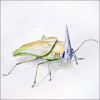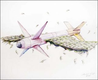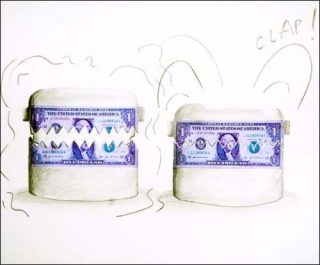 Un billet de banque américain dans lequel des crocs ont été découpés jaillit d’une niche comme un chien qui monte la garde. Plus loin, une tête de bœuf constituée d’autres dollars mâche des billets verts et des pistolets menacent des chaussures.