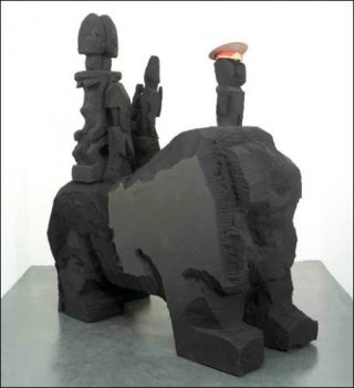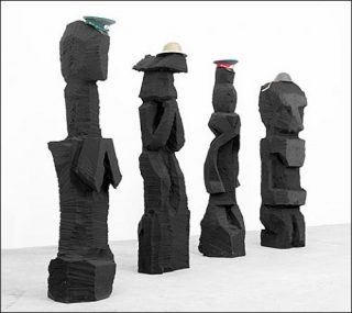 S’il y a volonté de démystifier, c’est par la caricature du modèle, le regard humoristique sur notre société et les symboles du pouvoir. Leurs grandes sculptures en mousse polyuréthane expriment cette ironie vis-à -vis des symboles militaires en mettant en scène des soldats sous la forme brute de totems aux formes primitives. On les reconnaîtra à leur casquette, ridicule symbole de la fonction qui vient chapeauter ces formes massives d’un noir profond. La pauvreté du matériau et la sculpture sans grâce faite à la va-vite donne un sentiment de vacuité à cet attribut du pouvoir.