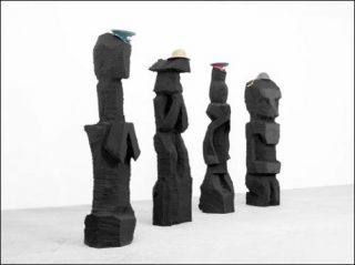 Dans la continuité de cette démarche de démystification des propagandes impériales, militaires et coloniales, trois séries d’imposantes sculptures sont installées dans la galerie. Noires et massives, ces sculptures qui rappellent des totems primitifs mettent en scène ici des soldats; là un personnage coiffé d’un képi s’avançant royalement sur un lion, incarnation par excellence d’un pouvoir ambivalent qui devient tyran en se croyant protecteur.