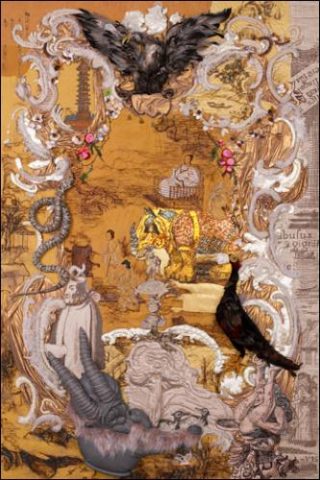 Sous des abords séduisants et colorés, six collages de très grands formats donnent à voir un point de vue alternatif sur l’histoire de l’humanité. La combinaison d’iconographies chinoises et occidentales à partir d’éléments rassemblés sur Internet — estampes chinoises traditionnelles, caricatures françaises du 19ème siècle, représentations médiévales, bestiaire exotique — via un patchwork de matières sensuelles (tissu, plumes, paillettes, cuir, perles) convoque le folklore des grandes tapisseries nationales dans une mise à distance des récits à la fois épiques et dérisoires de l’idéologie dominante.