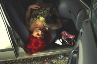 Un hématome, une coulure de sang — fort élégants au demeurant — font, de ses petites poupées, des cadavres bien propres sur eux. Comme dans un cluedo macabre, le lieu du crime est mis en scène. La série High Way to Hell repose sur un même schéma répété: des femmes, dans ou à l’extérieur d’une voiture, qui gisent dans des parures dignes de prostituées. Perruque blonde ou rouge, talons aiguilles et vernis à ongle, le maquillage du crime est parfait.