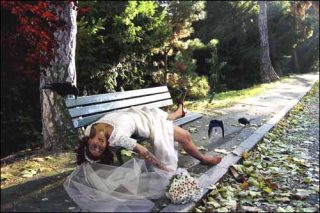 La petite histoire de Pute semble, quant à elle, plus ambiguë et plus riche à la fois. Une mariée abandonnée sur un banc public aux Buttes Chaumont, la robe retroussée, le bouquet s’échappant de sa main et le voile encore ceint autour de sa tête. L’ensemble repose sur l’ornement, l’apparence qui y est donné, dont on fait souvent l’empanache de la femme. Le plus beau jour de sa vie semble avoir fait son drame, abandonnée qu’elle est comme une vulgaire poupée de chiffon qu’on a oublié sur un banc public. Les corbeaux, amateurs de chairs putrides, se pressent déjà autour du cadavre, figurant peut-être le regard rapace du visiteur qui fouine l’image pour trouver le sens, la raison de ce drame intime.