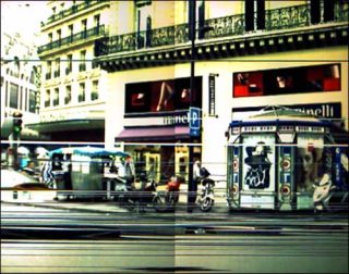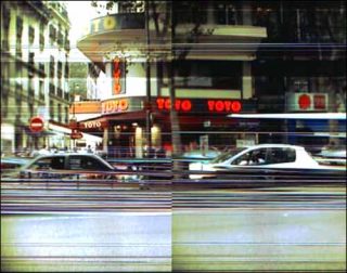 Il en ressort deux impressions contradictoires : d’une part le flux des moyens de transport, saisi concrètement, entraîne la ville dans son mouvement, comme une sorte de mécanique des fluides ; d’autre part les enseignes colorées aguicheuses, seuls éléments stables, focalisent le regard, développant tout leur pouvoir d’attraction.