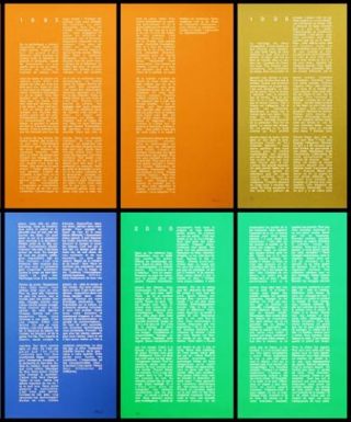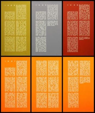 Toutes les années collectionnées sont caractérisées graphiquement par un fonds photographique imprimé d’aspect marbre, ou chacune a sa couleur spécifique allant du rouge au vert, du bleu au gris, etc. Les textes des slogans apparaissent eux toujours découpés sur un fond couleur or.
