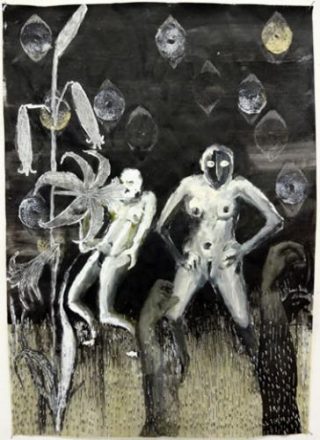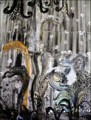 Les cariatides ou les nymphes, les éléments naturels, les plantes et les arbres, ainsi que d’autres formes végétales ou organiques forment des entrelacs baroques permettant à l’artiste de revisiter parallèlement les apports stylistiques du street art et du graffiti. Les scènes de genre et les paysages fournissent quant à eux le cadre idéal où peut s’épanouir l’état d’exaltation que les performances de l’artiste proposeront d’atteindre et d’entrevoir. Les vêtements, voiles irisés et imprimés des motifs dessinés par l’artiste, soulignent encore les ondulations serpentines du corps féminin au charme indomptable, au pouvoir de séduction potentiellement mortel, en souvenir, peut-être, de la célèbre danse exécutée par Salomé dans la Bible. Ces éléments et rappels créent une atmosphère à la fois obscure et hermétique, celle de rituels mystérieux et sensuels.