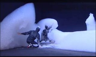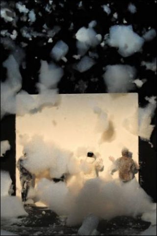 Il y a pourtant de purs moments de jouissance: des nuages de mousse envahissent la salle, se répandent littéralement dans les gradins. Les spectateurs se les passent comme des ballons, expérimentent leur texture. Un couple déambule sur scène entouré par de joyeux flocons de savon…