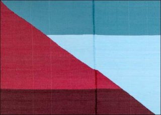 Sur chacune des toiles tissées de Brent Wadden s’articule une géométrie de formes et de couleurs souvent hypnotique. Une oeuvre pourra présenter une répétition de triangles et de rectangles (ou de lignes tout en couleurs, horizontales, verticales et diagonales). L’artiste fait d’autant plus vibrer l’harmonie générale de l’exposition que d’une toile à l’autre, il apporte de légères variations: les angles sont modifiés, les couleurs se déploient différemment, parfois une couture apparaît de manière plus proéminente. Quoi qu’il en soit, on y trouve à chaque fois le rythme visuel propre à la machine et la marque perturbatrice du fait-main.
