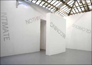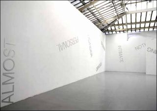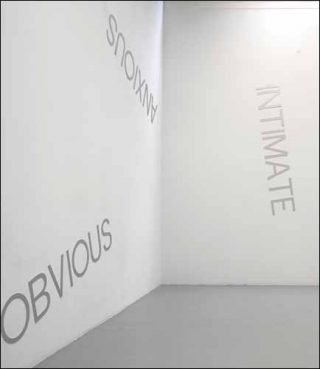 Le calme blanc des parois dénudées nous plonge immédiatement dans un contexte dépouillé de tout expressionnisme excessif. Les lettres capitales, gris métallisé, nous interpellent sans violence. A l’endroit, à l’envers, à l’horizontale ou à la verticale, les termes perdent tout d’abord leur légitimité et leurs propres sens de lecture.