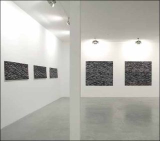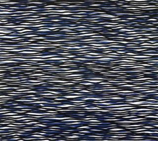Six formats carrés et quatre bandes horizontales se succèdent pour donner à voir une superposition de lignes ondulatoires de différentes couleurs. Tantôt bleues, kaki ou encore bordeau, les «vagues» recouvertes de leurs synonymes noirs impriment un mouvement dans l’espace de la pièce.