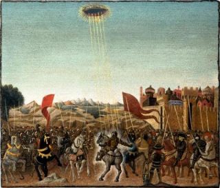 Avec des peintures à huile sur bois réalisées à la manière des primitifs flamands ou italiens, des néons aux messages et aux dessins paradoxaux, des vitrines ornementées de réels morceaux de comètes, de livres anciens dont celui de Galilée,… Laurent Grasso désoriente le temps, le diffracte, le multiplie et nous place «devant le temps»*, face à ces images inédites, précises et rares. Le temps des catastrophes, des guerres, des faux miracles, tout est remis dans l’orbite du doute méthodique, avec au centre du script toujours des personnages étranges, détournés, «subjectivés»: un troublant soleil double, des portraits de prophètes, un peuple en transe dans l’attente d’une apparition à Fatima, une île volcanique en éruption filmée par un drone comme arme de guerre, des paysages dont les cieux sont irradiés par la traversée de comètes.