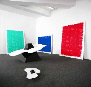 L’installation Solitario où neuf panneaux se succèdent en alternant monochromes, bois et miroir fait face à Cascade, véritable amas de filets, papiers pliés, cartes à jouer, le tout noué par des rubans fluorescents. L’ensemble est séduisant et laisse présager un jeu dont nous ne connaissons pas encore les règles.