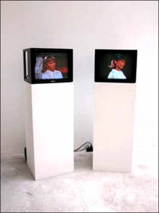 — Candice Breitz , Double Olivia (Hopelessly Devoted to you), 1977-2000. Installation : 2 DVD diffusés en boucle simultanément.