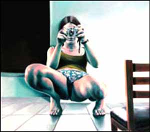 Non, parce que le même autoportrait, tout pictural qu’il est, constitue visiblement une réflexion sur la photographie — une tentative de déplacement et de dérèglement du très classique «instantané au miroir», appareil inclus —, et parce qu’il dialogue avec une photographie accrochée juste à côté, laquelle dissimule un portrait dans un rétroviseur (Ottonella Mocellin). Sensation troublante engendrée par cette mise en rapport : la peinture semble relever autant, sinon plus intensément du photographique, que la «vraie» photographie. Sans doute, tout l’intérêt est là : juxtaposer pour créer des liaisons productives, c’est-à -dire pour montrer qu’il y a, par-delà l’altérité plastique et l’autonomie supposée de chacun des travaux présentés, des correspondances de pensée.