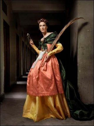 Une Apolline stupéfiante de vérité accueille le visiteur. La robe est la même que celle du tableau original de Zubaran, le clair obscur est digne maître… Aucun détail ne trahit la photo, à part les fils d’un Ipod volontairement oublié sur le cou du modèle.