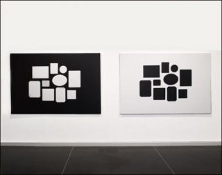 Les peintures de Sylvie Fanchon sont élaborées à partir de contraintes qu’elle s’impose : la bichromie, l’absence de profondeur optique, la neutralité. Elle emprunte ses référents à des images trouvées dans le quotidien tels des plans, des logos ou des taches, bulles, éclats, issus de la bande dessinée. Ce qui l’intéresse dans ces motifs, c’est leur simplicité, leurs formes abstraites. Les deux tableaux présentés au Frac forment un diptyque. Ils appartiennent à la série des «Accrochages» et font précisément référence aux accrochages du XIXe siècle dans les musées des beaux-arts qui occupaient l’espace du sol au plafond. Ici l’artiste s’intéresse plus précisément aux traces que laissent les tableaux sur les murs une fois décrochés. Ces deux peintures sont semblables à des «positifs-négatifs» ou des «recto-verso» que l’artiste a choisi de présenter largement écartés. Une brèche est ainsi ménagée entre les deux tableaux comme pour souligner encore l’écart entre deux temporalités.