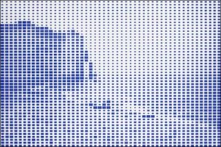 Pour son Paysage Fantôme n°5, Xavier Veilhan a procédé par soustraction. Au cours de la fabrication, la plaque d’aluminium préalablement laquée a été sablée mécaniquement pour produire une grille de pixels conçue auparavant par informatique. Ainsi naît — le sablage ôtant par endroits la couche de laque — le motif d’un paysage simplifié qu’on ne perçoit pas immédiatement mais qui évoque sans conteste les Falaises d’Etretat et de façon plus générale, la peinture impressionniste. La notion de discontinuité intéressait déjà les peintres à la fin du XIXe siècle. On peut citer l’exemple de Georges Seurat, véritable précurseur, dont les tableaux sont constitués de la juxtaposition de points de couleur.