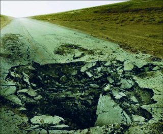 Jusqu’à Eleven Blow Up, l’un de ses plus récents travaux, dont trois images géantes collées à même les murs dominent le hall d’entrée du Jeu de Paume. Des béances noires dans le bitume, au cœur de paysages qui évoquent l’Irak. Ces cratères-tombeaux, qui semblent avoir tout avalé des attentats à la bombe qui les ont provoqués, ont été prélevés dans des bandes vidéos de l’agence Reuter, recomposés avec des photographies de l’artiste.