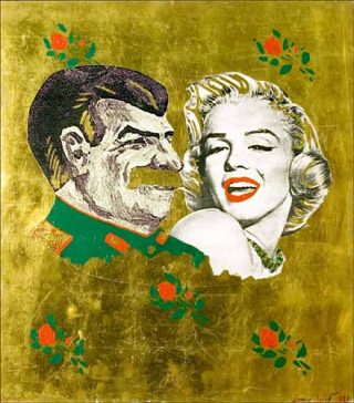 A côté, une toile de sa période américaine, datée de 1985, condense de façon exemplaire les enjeux du «Sots Art»: le portrait de Staline jouxte intimement celui de Marilyn Monroe, dans un traitement pop proche de Warhol, sur fond doré à la feuille d’or et parsemé de roses. Liaison, voire collision, entre la tradition de l’icône et le kitsch, entre l’imagerie populaire de la star américaine et celle du petit père du peuple, l’œuvre propose une véritable «iconoclastie» sous la forme d’un objet d’idolâtrie.