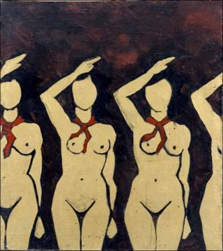 — Pionnières [i.e. girl scouts], 1972. Huile, bronze peint, sur toile. 80 x 70,5 cm