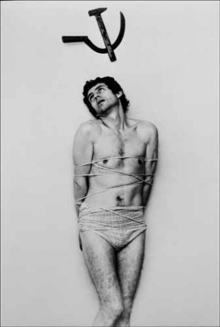 D’autres pièces de l’artiste ponctuent l’exposition, comme, dans la même veine, La Trinité, bronze de 2007, montrant Lénine, Mickey et Jésus se tenant par la main et avançant d’un pas décidé, tête haute, ou encore, du même artiste, au début de l’exposition, une œuvre plus ancienne, un autoportrait de 1980, une photographie tirée du Triptyque de l’Adoration : Saint Sébastien : reprenant la posture et l’iconographie du martyr chrétien, l’artiste pose sous la figure tutélaire, non pas d’une croix, mais d’une faucille croisant un marteau.