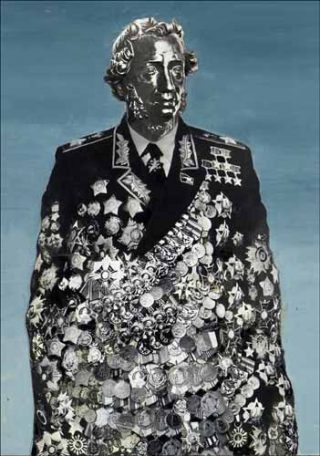 Dans le premier cas, on peut penser à Igor Moukhine qui fixe par la photographie la disparition des vestiges du monde soviétique, des monuments et des sculptures supprimés peu à peu dans les parcs, mais aussi à Irina Korina, une des plus jeunes artistes de l’exposition, qui reconstitue de façon factice, au bout d’un couloir, une mosaïque figurant des cosmonautes, comme celles qui, parmi les œuvres monumentales, avait dû peupler son enfance ; on peut penser aussi, dans la même thématique, à l’œuvre ludique et parodique de Rostan Tavasiev, La Chute du satellite, assemblage de 2007, mêlant personnage en peluche rouge, satellite crevant la toile, sapin de noël représenté, étoile rouge, le tout dans un registre narratif d’un kitsch manifeste.