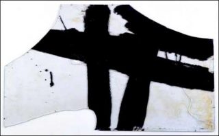 Pour autant, les coulures de goudron sur des vitres de récupération, et les idéogrammes complexes et enchevêtrés au brou de noix sur papier blanc, annoncent déjà une retenue, une forme de retrait du corps et du sujet. Les matériaux, exogènes à la tradition picturale, sont travaillés en gestes, non pas expressionnistes, mais objectivant leurs qualités propres: fluidité du goudron et diaphanéité sombre du brou.